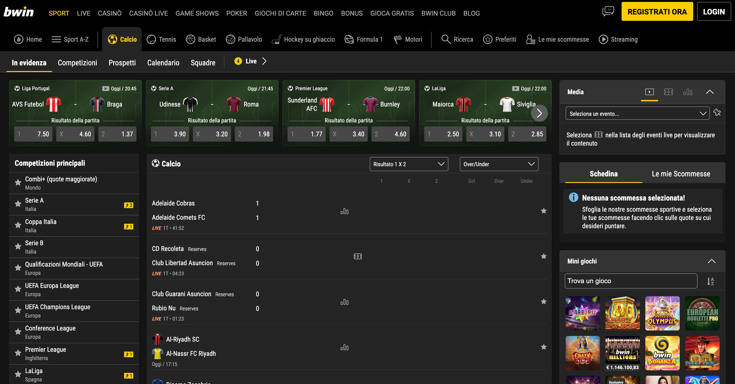 Bwin rappresenta uno dei marchi più riconosciuti nel settore delle scommesse sportive online a livello globale. Con decenni di esperienza nel settore, questa piattaforma offre agli utenti italiani un'esperienza di betting completa e professionale, caratterizzata da un palinsesto sportivo estremamente ricco che copre oltre 90 discipline diverse. La piattaforma si distingue particolarmente per la qualità dello streaming live, che consente di seguire migliaia di eventi in diretta mentre si scommette, e per l'ampiezza dei mercati disponibili su ciascun evento.