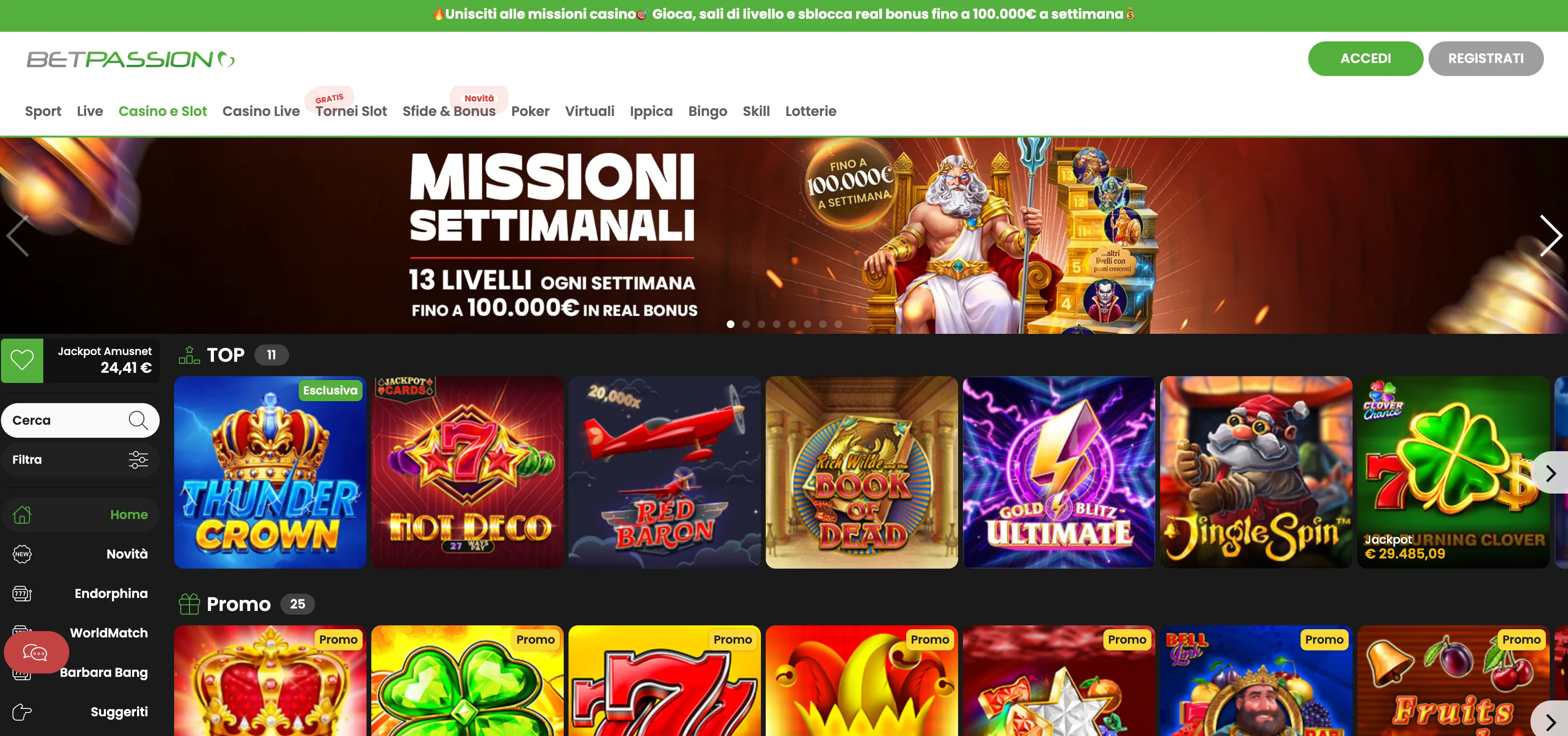 | BetPassion | 200% fino a €1.500 | 8.8/10 | Carte, PayPal, crypto | ✓ | 4.000+ |