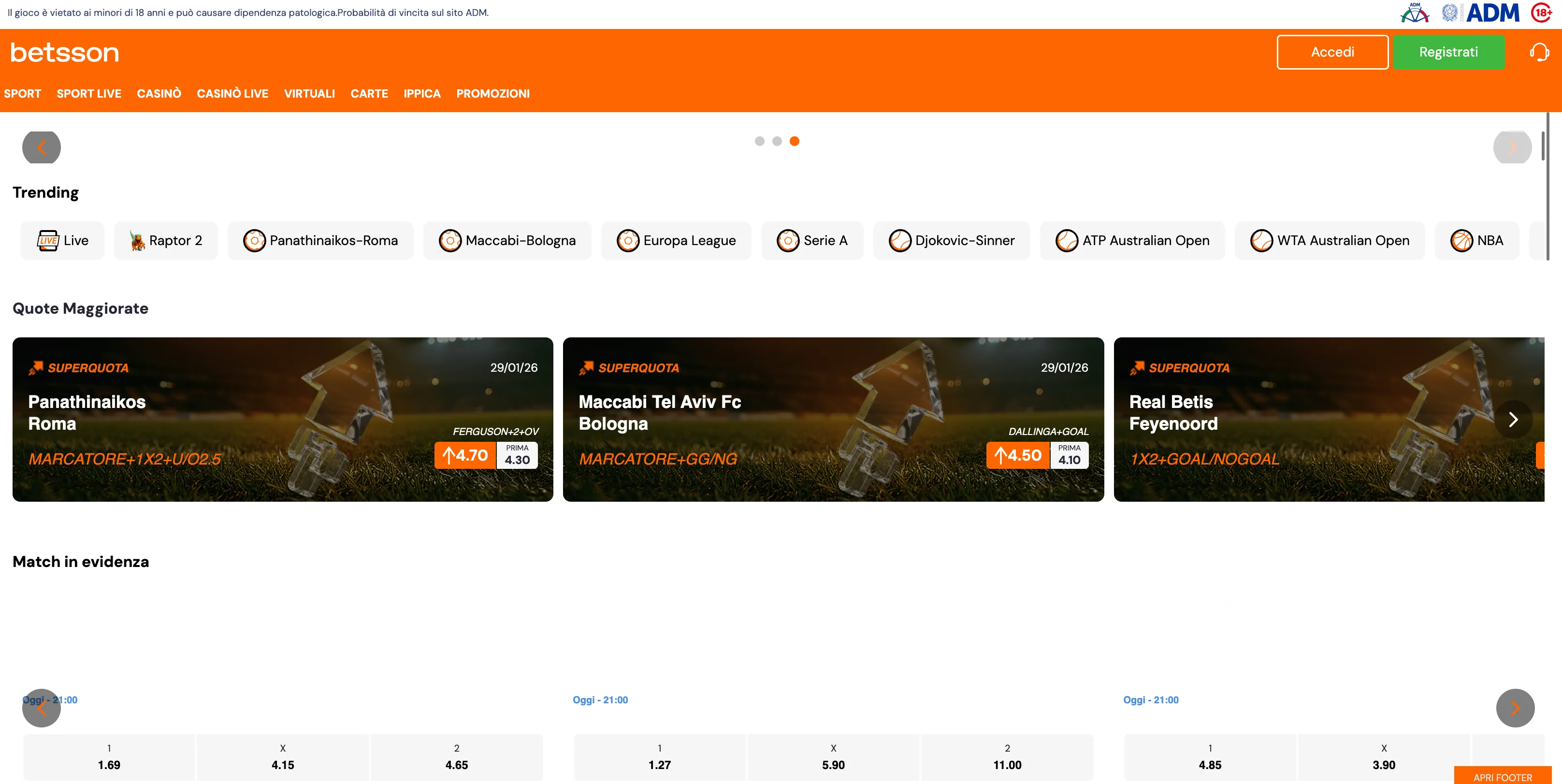 | Betsson | 100% fino a €500 + 100 FS | 9.5/10 | Visa, Mastercard, Skrill, Neteller | ✓ | 2.500+ |