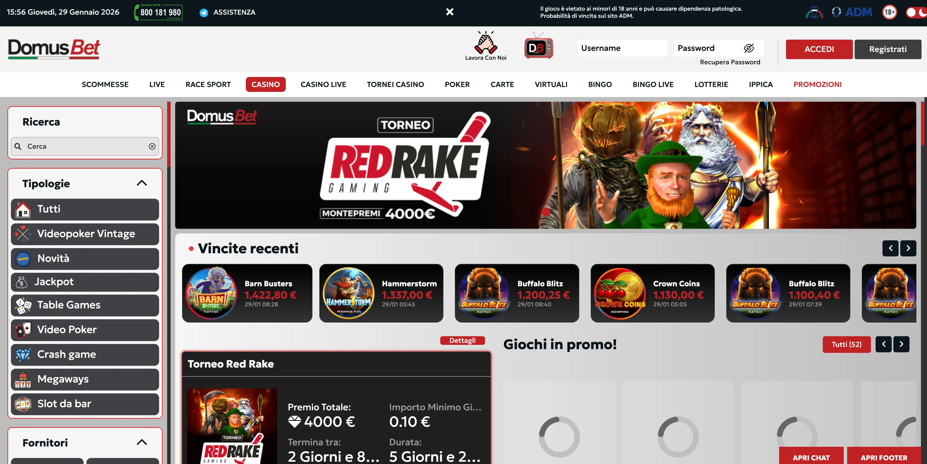 | DomusBet | 100% fino a €2.000 | 9.0/10 | Carte, e-wallet, bonifico | ✓ | 3.500+ |