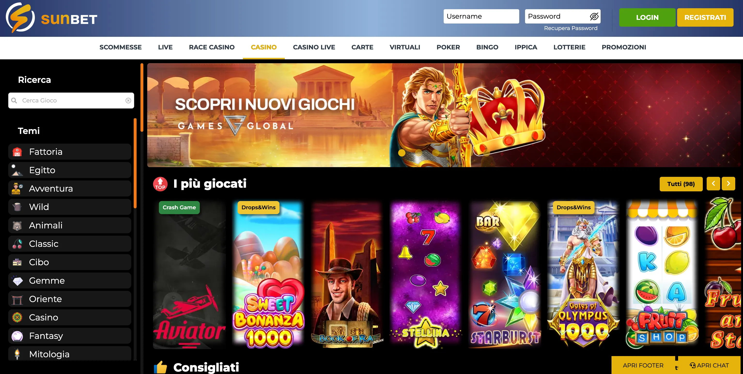 | SunBet | 150% fino a €800 | 8.7/10 | Visa, Mastercard, Skrill | ✓ | 2.800+ |